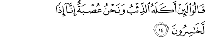 Mereka berkata: "Kalau dia dimakan oleh serigala, sedang kami ramai bilangannya, sesungguhnya kami sudah tentu menjadilah orang-orang yang rugi".