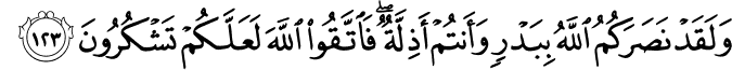 Dan sesungguhnya Allah telah menolong kamu mencapai kemenangan dalam peperangan Badar, sedang kamu berkeadaan lemah (kerana kamu sedikit bilangannya dan kekurangan alat perang). Oleh itu bertaqwalah kamu kepada Allah, supaya kamu bersyukur (akan kemenangan itu).