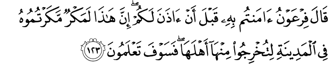 Firaun berkata: "Patutkah kamu beriman kepadanya sebelum aku memberi izin kepada kamu? Sesungguhnya ini adalah perbuatan tipu daya yang kamu lakukan dalam bandar ini kerana kamu hendak mengeluarkan penduduknya dari padanya. Oleh itu, kamu akan mengetahui (akibatya).