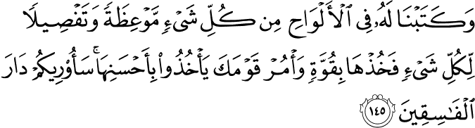 Dan Kami telah menuliskan bagi Nabi Musa pada Lauh-lauh (Taurat) itu, dari pelbagai jenis nasihat pengajaran dan penjelasan bagi tiap-tiap sesuatu (dasar Syariat dan hukum-hukumnya). Oleh itu, terimalah dia (dan amalkanlah wahai Musa) dengan bersungguh-sungguh, dan suruhlah kaummu berpegang (serta mengamalkan) yang sebaik-baiknya (iaitu suruhan-suruhannya). Aku akan perlihatkan kepada kamu akan negeri orang-orang yang fasik - derhaka".