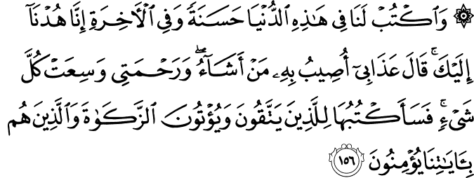 "Dan tetapkanlah untuk Kami kebaikan dalam dunia ini dan juga di akhirat, sesungguhnya kami kembali (bertaubat) kepadaMu". Allah berfirman: "AzabKu akan Aku timpakan kepada sesiapa yang Aku kehendaki, dan rahmatKu meliputi tiap-tiap sesuatu; maka Aku akan menentukannya bagi orang-orang yang bertaqwa, dan yang memberi zakat, serta orang-orang yang beriman kepada ayat-ayat Kami.