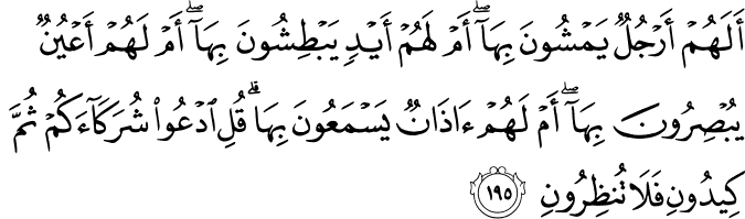 Adakah benda-benda (yang kamu sembah) itu mempunyai kaki yang mereka dapat berjalan dengannya, atau adakah mereka mempunyai tangan yang mereka dapat memegang (menyeksa) dengannya, atau adakah mereka mempunyai mata yang mereka dapat melihat dengannya, atau adakah mereka mempunyai telinga yang mereka dapat mendengar dengannya? Katakanlah (wahai Muhammad): "Panggilah benda-benda yang kamu jadikan sekutu Allah, kemudian kamu semua jalankan tipu daya terhadapku, serta jangan pula kamu bertangguh lagi.