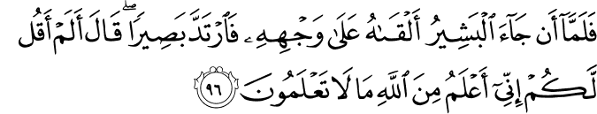 Maka sebaik-baik sahaja datang pembawa khabar berita yang mengembirakan itu, dia pun meletakkan baju Yusuf pada muka Nabi Yaakub, lalu menjadilah ia celik kembali seperti sediakala. Nabi Yaakub berkata: "Bukankah aku telah katakan kepada kamu, sesungguhnya aku mengetahui (dengan perantaraan wahyu) dari Allah akan apa yang kamu tidak mengetahuinya?"