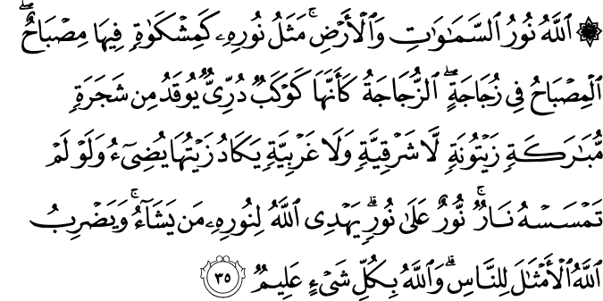 Allah yang menerangi langit dan bumi. Bandingan nur hidayah petunjuk Allah (Kitab Suci Al-Quran) adalah sebagai sebuah "misykaat" yang berisi sebuah lampu; lampu itu dalam geluk kaca (qandil), geluk kaca itu pula (jernih terang) laksana bintang yang bersinar cemerlang; lampu itu dinyalakan dengan minyak dari pokok yang banyak manfaatnya, (iaitu) pokok zaitun yang bukan sahaja disinari matahari semasa naiknya dan bukan sahaja semasa turunnya (tetapi ia sentiasa terdedah kepada matahari); hampir-hampir minyaknya itu - dengan sendirinya - memancarkan cahaya bersinar (kerana jernihnya) walaupun ia tidak disentuh api; (sinaran nur hidayah yang demikian bandingannya adalah sinaran yang berganda-ganda): cahaya berlapis cahaya. Allah memimpin sesiapa yang dikehendakiNya (menurut undang-undang dan peraturanNya) kepada nur hidayahNya itu; dan Allah mengemukakan berbagai-bagai misal perbandingan untuk umat manusia; dan Allah Maha Mengetahui akan tiap-tiap sesuatu.