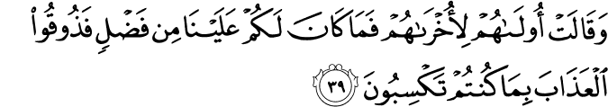 Dan berkatalah golongan pertama (ketua-ketua), di antara mereka, kepada golongan yang akhir (pengikut-pengikutnya): "(Jika demikianlah hukuman Tuhan), maka tidak ada bagi kamu sebarang kelebihan atas kami". (Allah berfirman): "Oleh itu rasalah kamu azab seksa disebabkan apa yang kamu telah usahakan".